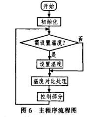 系統(tǒng)程序的設(shè)計思想為:設(shè)置標(biāo)準(zhǔn)溫度范圍后,溫度傳感器DS18B20對環(huán)境溫度進(jìn)行采樣,將采樣值與預(yù)設(shè)溫度值進(jìn)行比較,如果采樣值高于或低于預(yù)設(shè)溫度值時,系統(tǒng)通過繼電器啟動加熱或降溫電路工作。主程序流程圖如圖6所示。