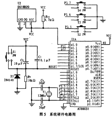 按鍵s1用于對系統(tǒng)進(jìn)行復(fù)位操作,按下一次,系統(tǒng)自動復(fù)位一次;按鍵s2、s3、s4用于設(shè)置最小溫度值和最大溫度值,按鍵s2被按下時系統(tǒng)加1操作,按鍵s3被按下時系統(tǒng)減1操作,按鍵s4為確認(rèn)鍵。